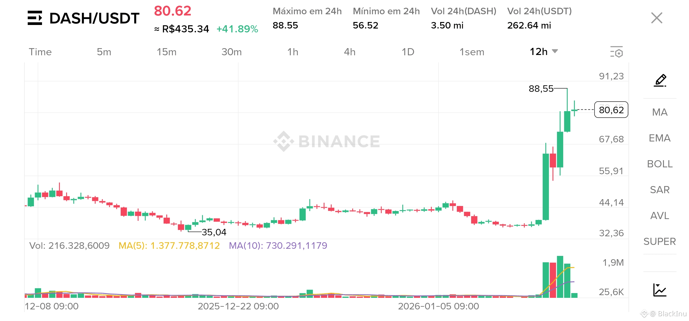 Máxima do dia em 88.55, mínima em 56.52 — volatilidade EXTREMA. Volume altíssimo: 262.64M USDT.