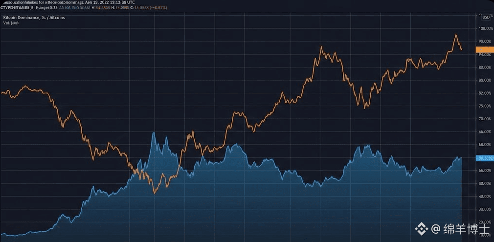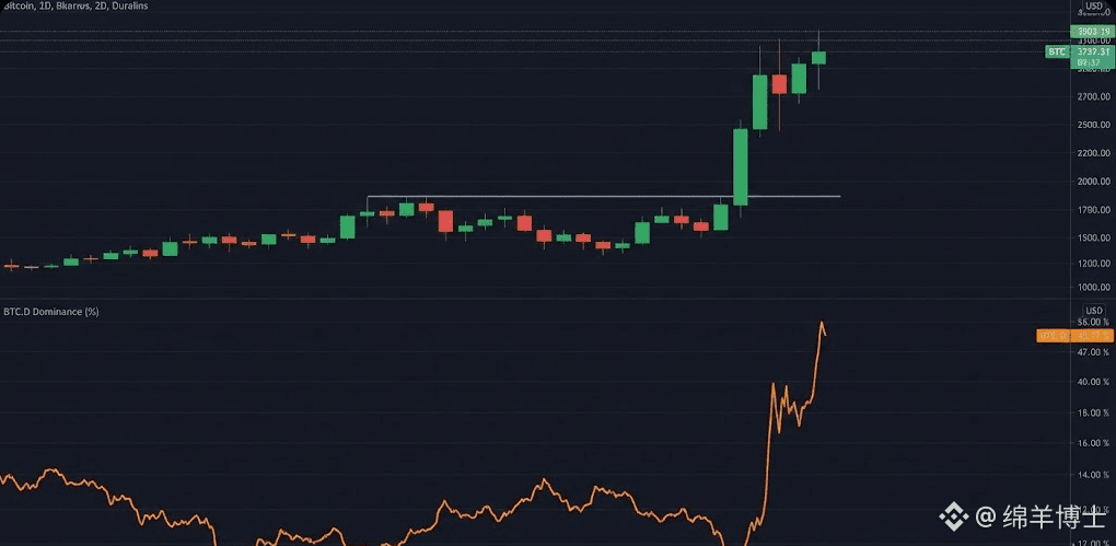 为了说明这一点,我特意做了一张图。上面的K线是比特币价格,下面的橙色线是 BTC.D。你可以清楚地看到,当比特币价格突破拉升时,主导率也在同步飙升。这就是最典型的吸血行情。