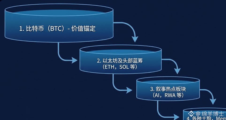 这个过程就像水从瀑布顶端流下来。如果顶端的水(BTC)还没溢出来,底下的水潭(山寨币)自然是干涸的。我做了一张流程图来形象地展示这个过程。