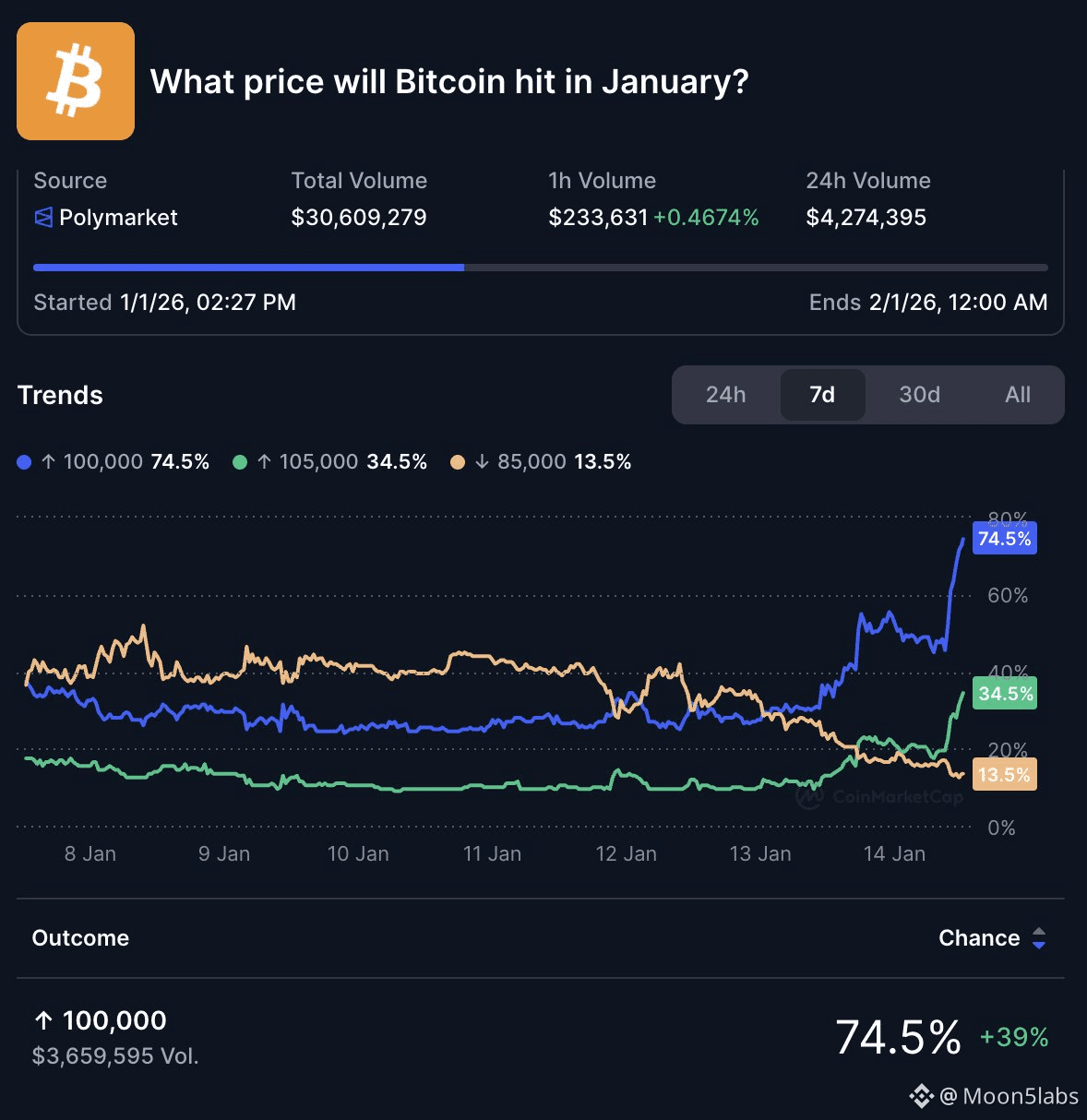 On Polymarket, odds for Bitcoin hitting $100K before January 31st now exceed 74%.