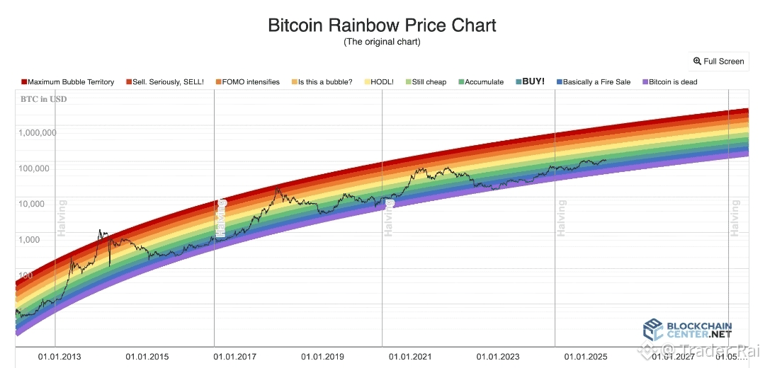 At its core, the Bitcoin Rainbow Chart is a logarithmic price chart with colored bands layered on top. Each band represents a long-term valuation zone, ranging from “historically cheap” to “extremely overheated.”
