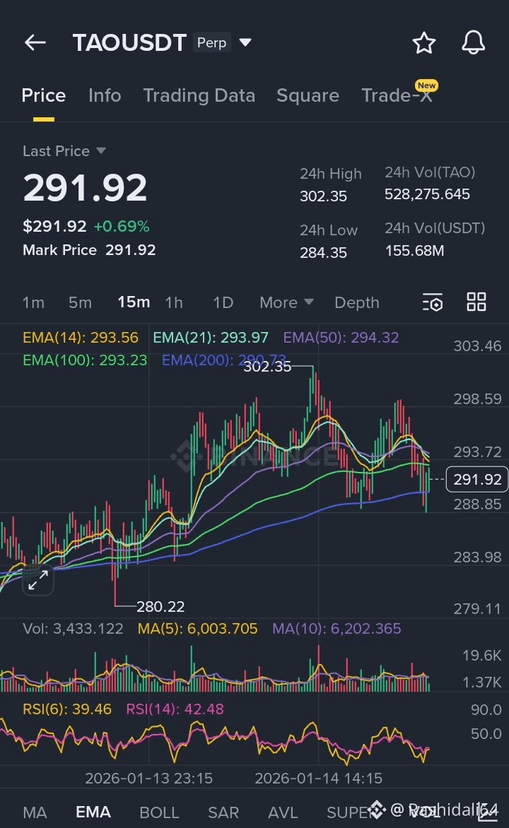 $TAO previously made a strong move up from the 280 zone and pushed close to 302 📈. After that impulse, price failed to hold the highs and began moving sideways with a slow pullback. Currently, it is trading around 291–292, which is an important support area within this range 🟢.