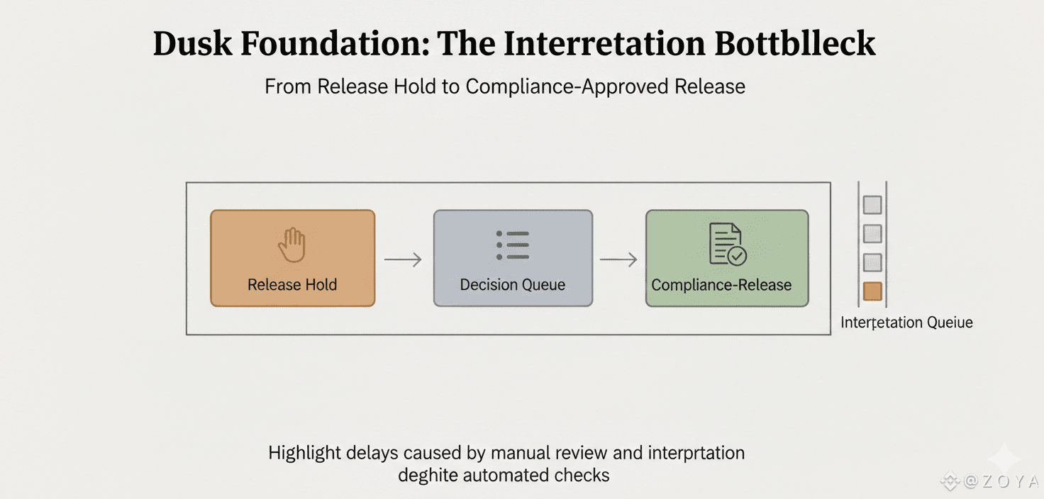 Interpretation becomes the metric. Time to defensible decision—not chain finality—is what matters. The system looks stable, so teams assume speed. But the human queue tells a different story. Evidence is legible, but only if the workflow matches it. Dusk doesn’t let teams hide behind “proof exists.” The rules fire, the release waits, and that pause is where real control lives.