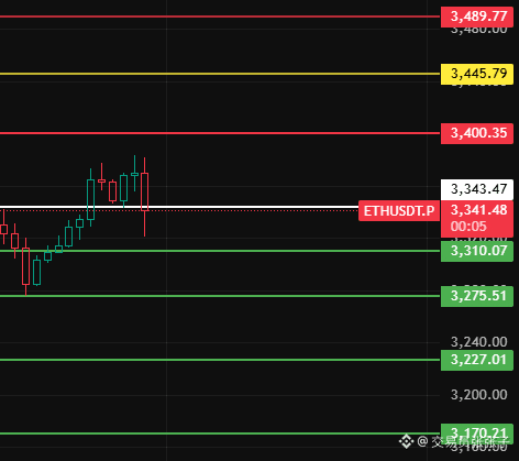 如果夜间1-2小时级别收不上3343上方,那说明反弹力度不大,再次下跌下方支撑位留意3310-3275-3227这几个位置附近!#ETH走势分析