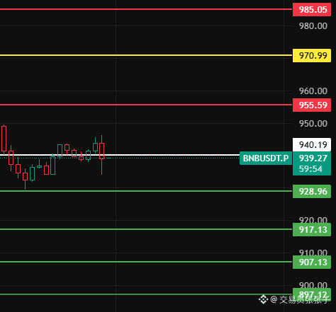 如果夜间1-2小时级别收不上940上方,那说明反弹力度不大,再次下跌下方支撑位留意929-917-907这几个位置附近!#BNB走势
