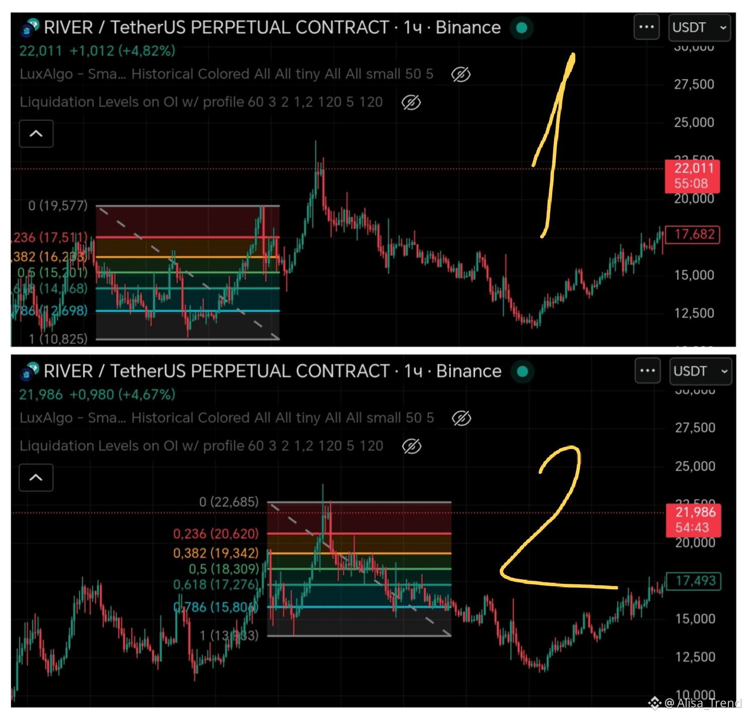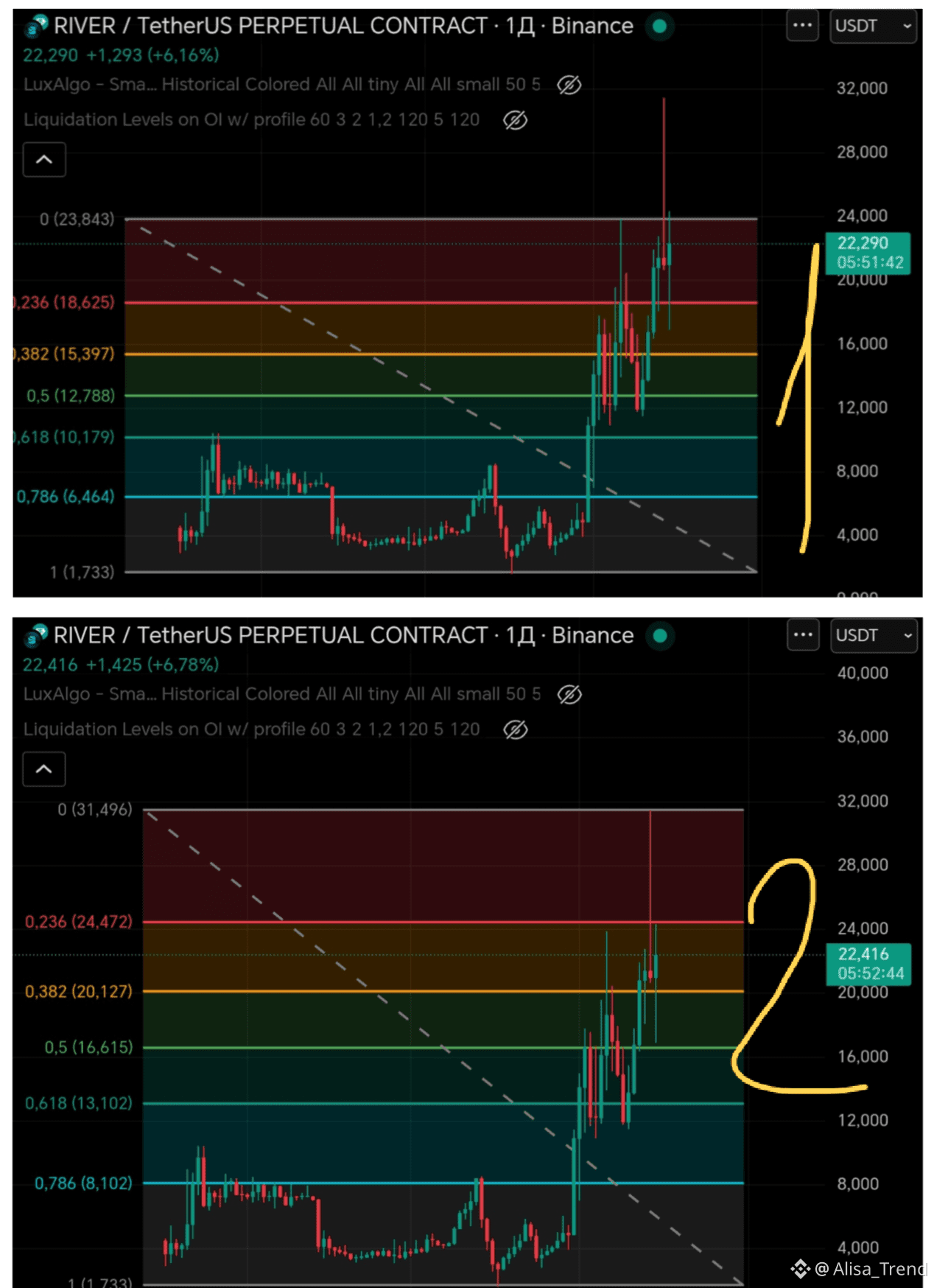 Фото 2: Я перетянула Фибоначчи с фото 1 на эту волну и получила точку в шорт 22.68. В этой волне цена долго стояла в боковике между 0.382 и 0.5, но по итогу свалилась в коррекцию. (Внимание, этот разбор до того как монета обновила свой максимум на 30+) А то налетят сейчас Хейтеры со словами: «ха-ха-ха шорт с 22.68 когда монета пошла на 30+ ха-ха-ха умно» Да есть и такое. Я взяла эту монету из-за стабильности движения, чтоб не показывать вам на разных монетах, а весь путь от А до Я пройти на одной монете, чтоб вы не путались🙂