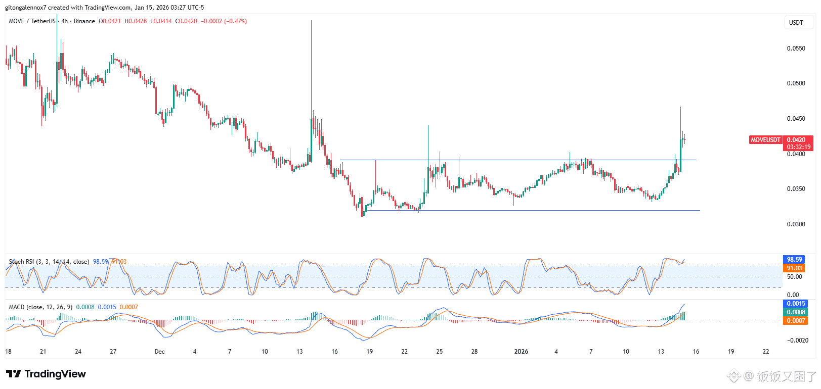 从价格走势图来看,MOVE 已经突破了自 12 月中旬以来的横盘整理区间,价格在 0.0336 美元至 0.0400 美元之间波动。各项技术指标显示,上涨势头明显:MACD 稳步上行,随机相对强弱指数(Stochastic RSI)显示买方主导市场。