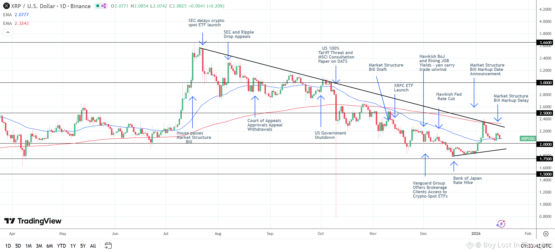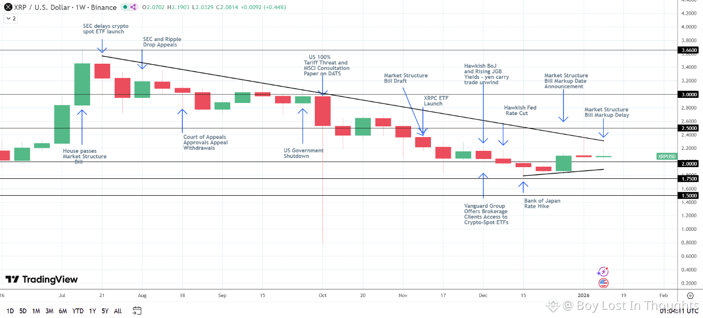 XRP faced selling pressure after the U.S. Senate delayed a pivotal crypto market structure bill, a move triggered by Coinbase's criticism and withdrawal of support. This underscores XRP's high sensitivity to American regulatory shifts. However, the decline was contained as bulls defended critical support at the $2.00 level. Underlying strength from significant XRP-spot ETF inflows and continued progress toward eventual legislation maintains a cautiously bullish outlook, with analysts holding firm on medium-term price targets between $3.00 and $3.66, provided the token stays above key support.