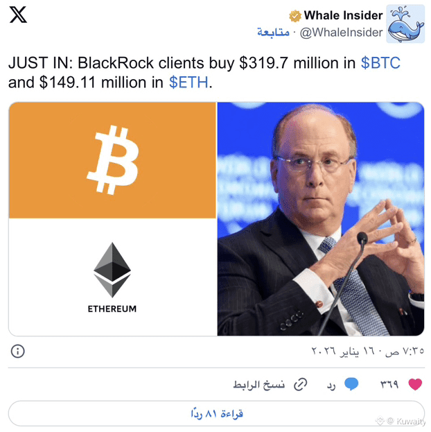 كشفت أخبار بلاك روك اليوم عن خطوة كبيرة جديدة. ففي 15 يناير، ضخ المستثمرون نحو 468 مليون دولار في صناديق بلاك روك المتداولة لبيتكوين وإيثريوم. وبحسب بيانات Whale Insider، اشترى العملاء $BTC بقيمة 319.7 مليون دولار، و $ETH بقيمة 149.11 مليون دولار، في يوم واحد.