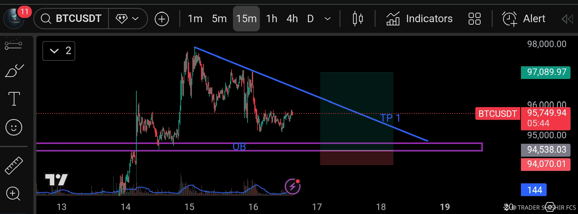 নিচে স্পষ্টভাবে একটি bullish order block (OB) মার্ক করা আছে, যেখান থেকে প্রাইস আগেও ভালো রিঅ্যাকশন দিয়েছে।