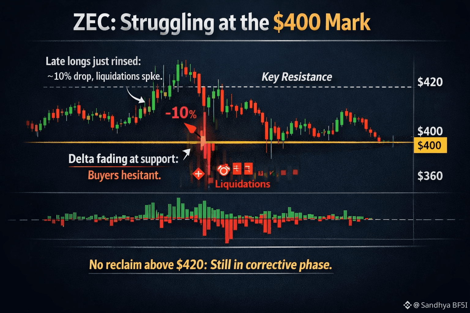 ZEC is once again hovering near the psychological $400 zone, but the context matters. The recent dip wasn’t random — late long positioning got squeezed hard, with roughly a 10% drawdown triggering visible liquidations. That washout has drained momentum, and you can see it in the tape: delta is fading around support, signaling hesitation rather than confident dip-buying.