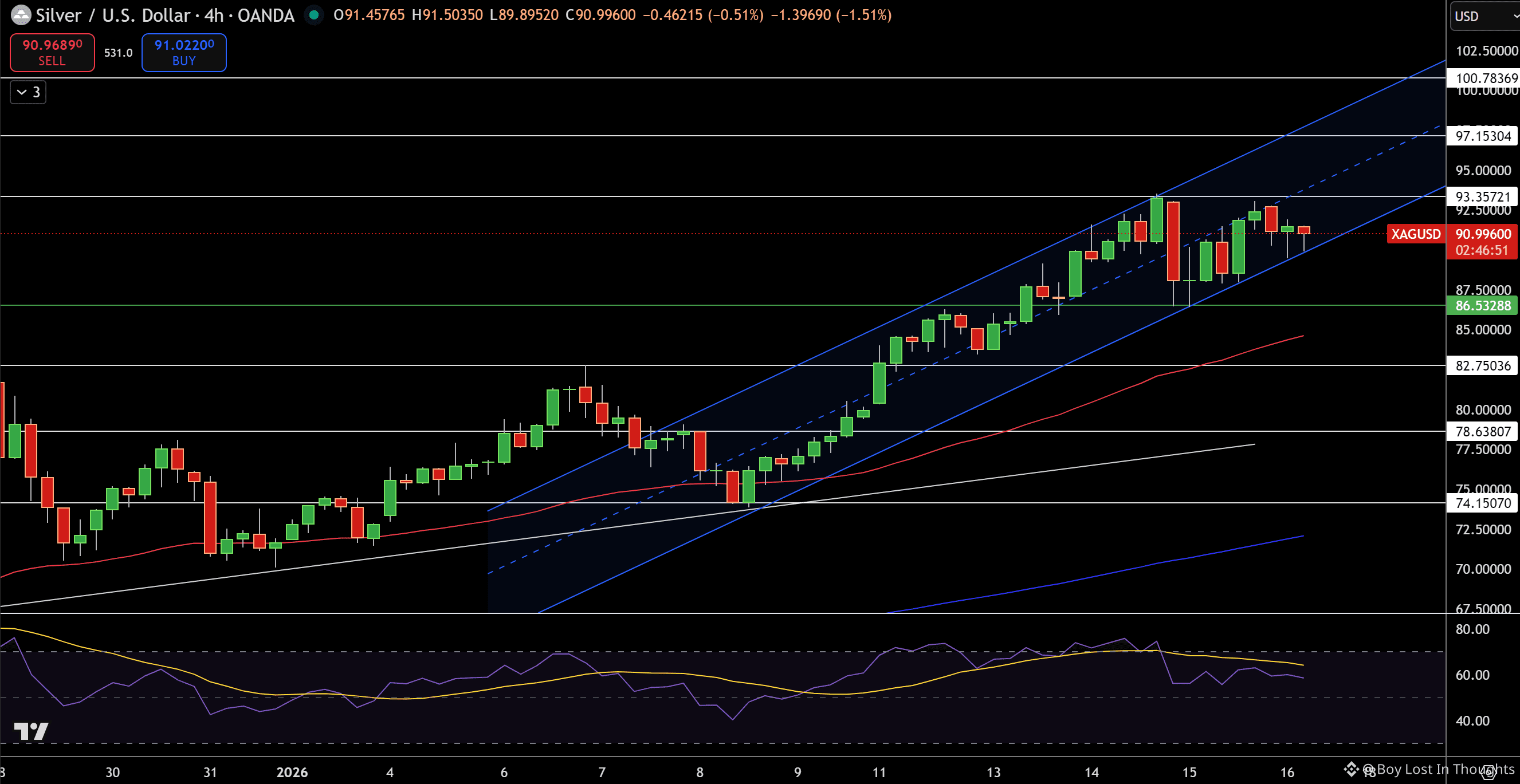Silver Technical Outlook: Silver is testing support near $87.50, with a break lower potentially opening a move toward $86.50. Resistance sits near $93.35–$97.15.