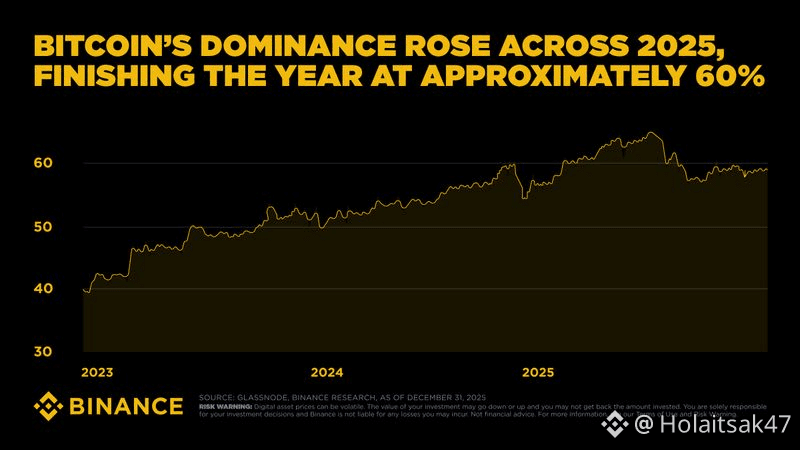 Dominance climbed to ~60% not because everything else collapsed — but because capital consolidated around what felt safest during macro uncertainty.