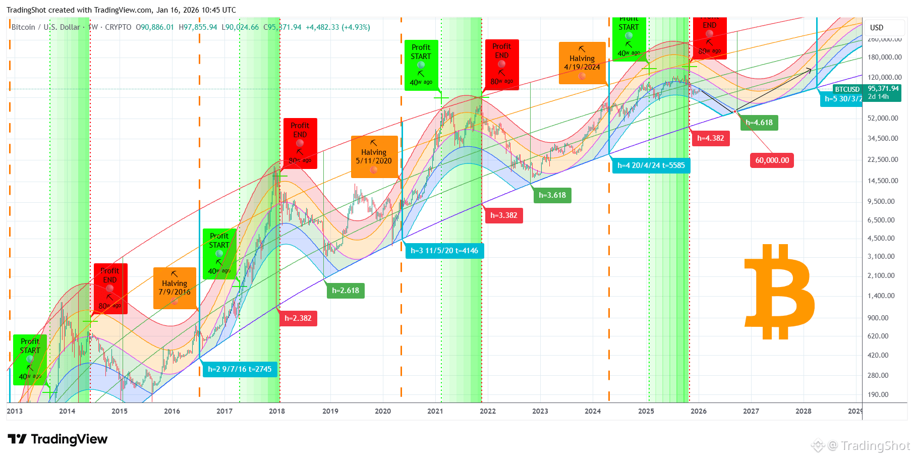 With the next Halving estimated in April 2028, we will still be far from the start of the Profit Taking Zone (green vertical layers), which historically starts taking place around 38 weeks (266 days) after the Halving, but the 4.618 Time Fib its technically ideal for long-term buying again. Based on this model the price should be at least at $60000 by that time.