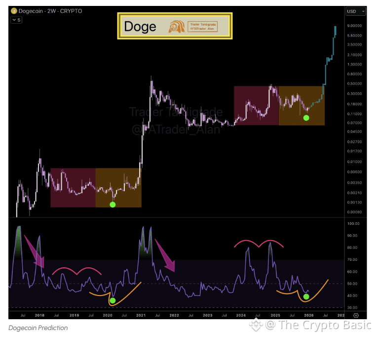 On the social media commentary side, Trader Tardigrade, an analyst on X, highlighted that Dogecoin’s RSI has recently retraced, setting the stage for a potential massive surge. As seen in the 2-week chart, the RSI has followed a similar pattern to previous cycles.