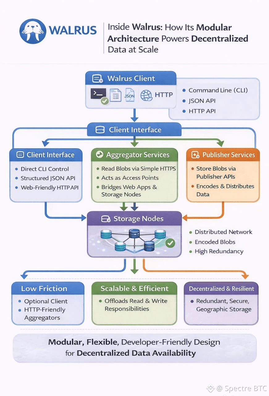 Walrus is designed as a purpose-built decentralized data availability and storage network, and its real strength comes from how its components work together rather than relying on a single, monolithic system. Instead of forcing every user or application to interact directly with raw infrastructure, Walrus uses a layered architecture that balances flexibility, performance, and decentralization. This makes it suitable not only for developers, but also for everyday users who may never even realize they are using decentralized storage under the hood.