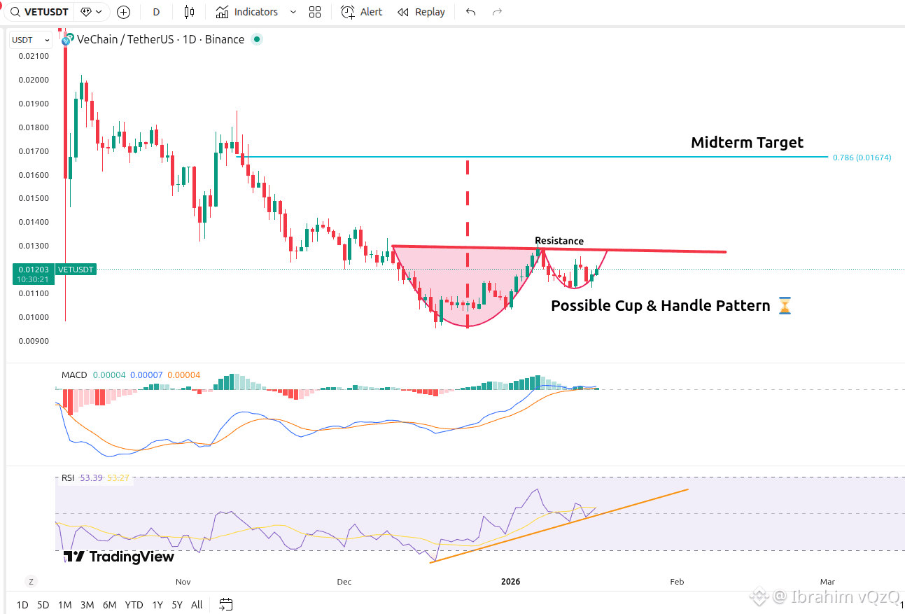 VET is currently in a "Wait-and-See" phase. While the $0.0115 support is holding, the momentum is lacklustre. Aggressive traders are entering "Long" with tight stops at $0.0110, while conservative traders are waiting for a breakout above the $0.0125 resistance to confirm the start of a new bullish wave.