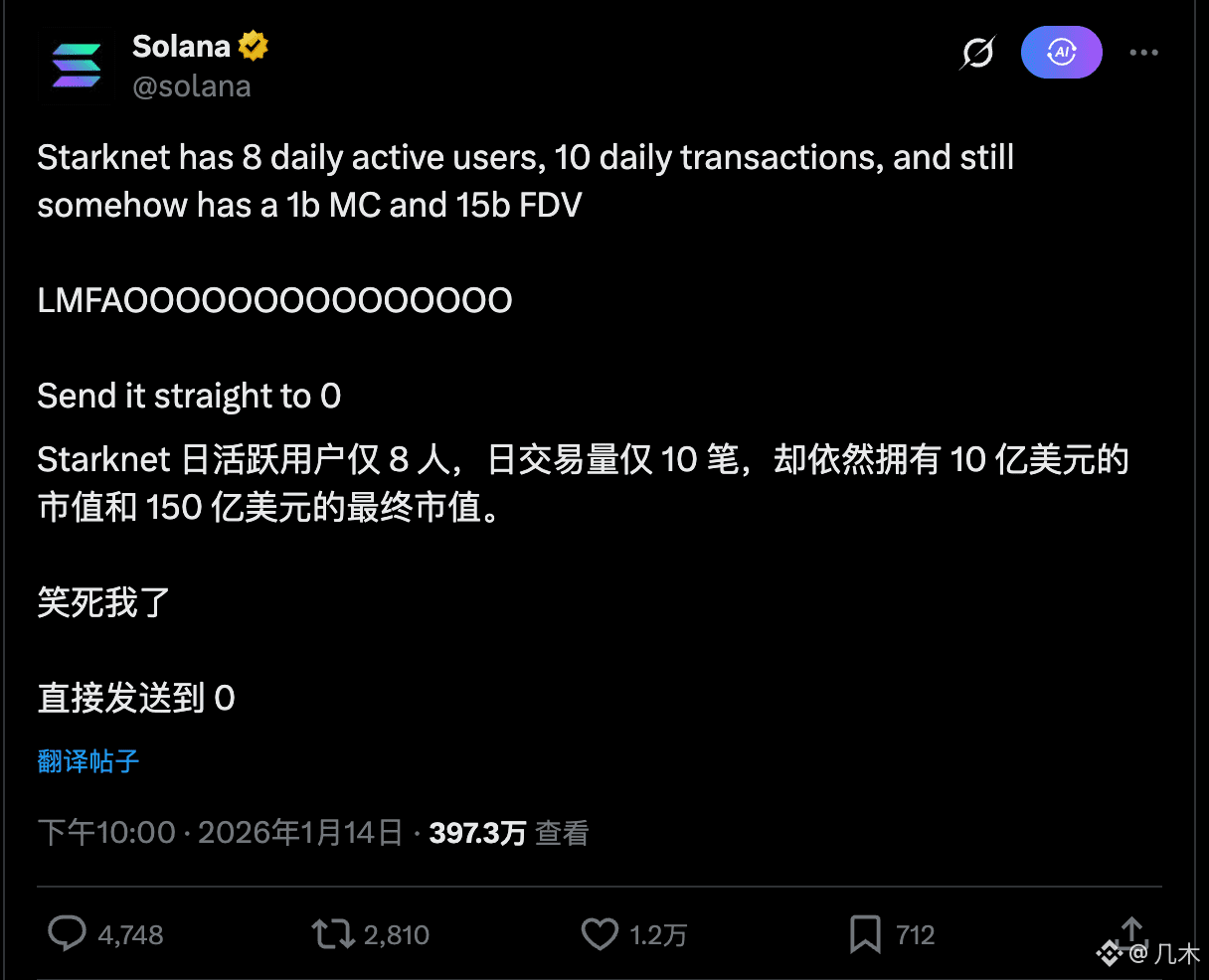 知道很多公链无人问津,但Solana官推这条内容依旧让我震惊。Starknet 怎么说也是 L2 时代的“四大天王”之亿,融资数亿美金,竟然沦落到这个地步?这让我不经想知道,当空投落地,潮水退去,那些传说中的“天王级”项目,现在到底怎么样了?
