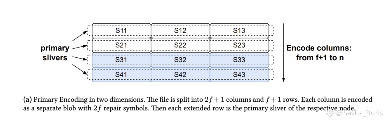 The blob is split into a two dimensional grid of slivers with cryptographic commitments assigned to each piece
