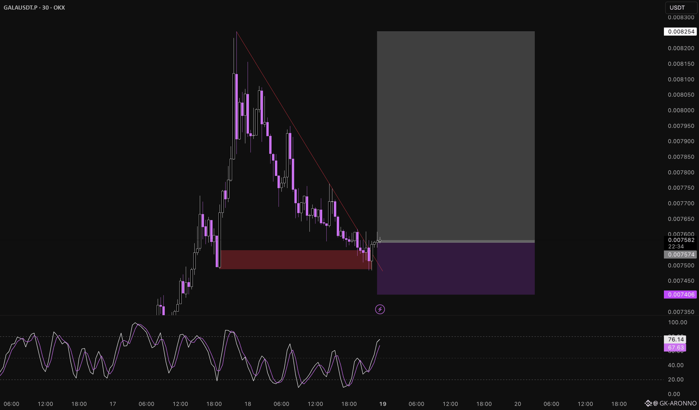 On the GALAUSDT.P 30m chart, price has been grinding lower under a descending trendline. We’re now at a key inflection: price is testing the demand/support base (red zone) while attempting to break and reclaim above the downtrend line. This is a typical “sell-off → base → reclaim” structure where a bounce can accelerate once the trendline is invalidated.
