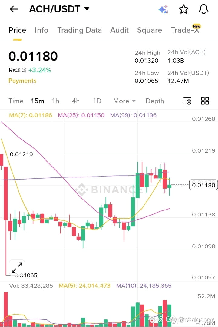 $ACH is stabilizing after a sharp sell-off into the 0.0106 liquidity zone, followed by a controlled rebound. Price is now consolidating around reclaimed short-term averages, suggesting the market is attempting to build a base rather than extend lower.