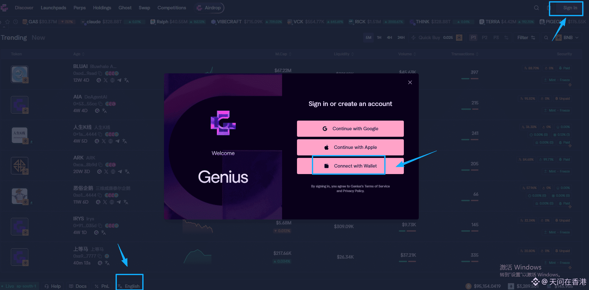 左下角选中文→右上角Sign in(登录)→Connect With WALLET→可以选币安、OK、小狐狸等钱包,看你哪个用的习惯→EVM Networks