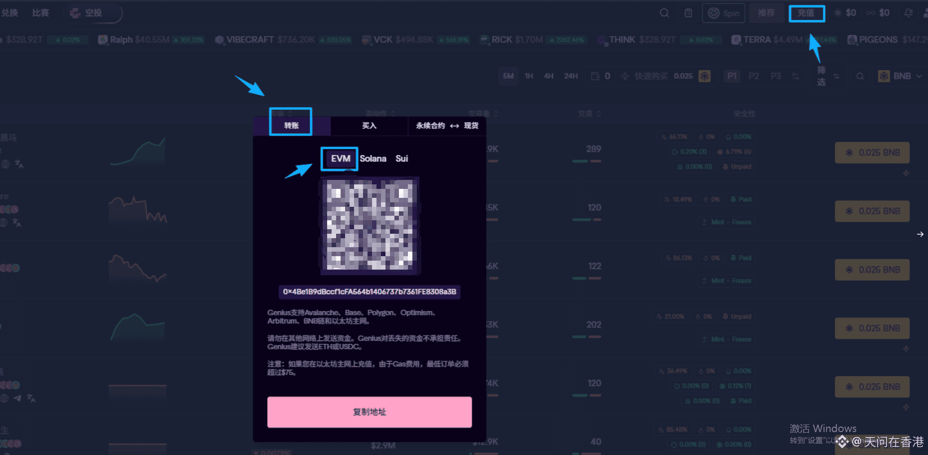 我习惯是用BNB链,所以这次以这个为教程基础。右上角充值→转账→EVM,复制地址后充值USDT/USDC/BNB(GAS费)