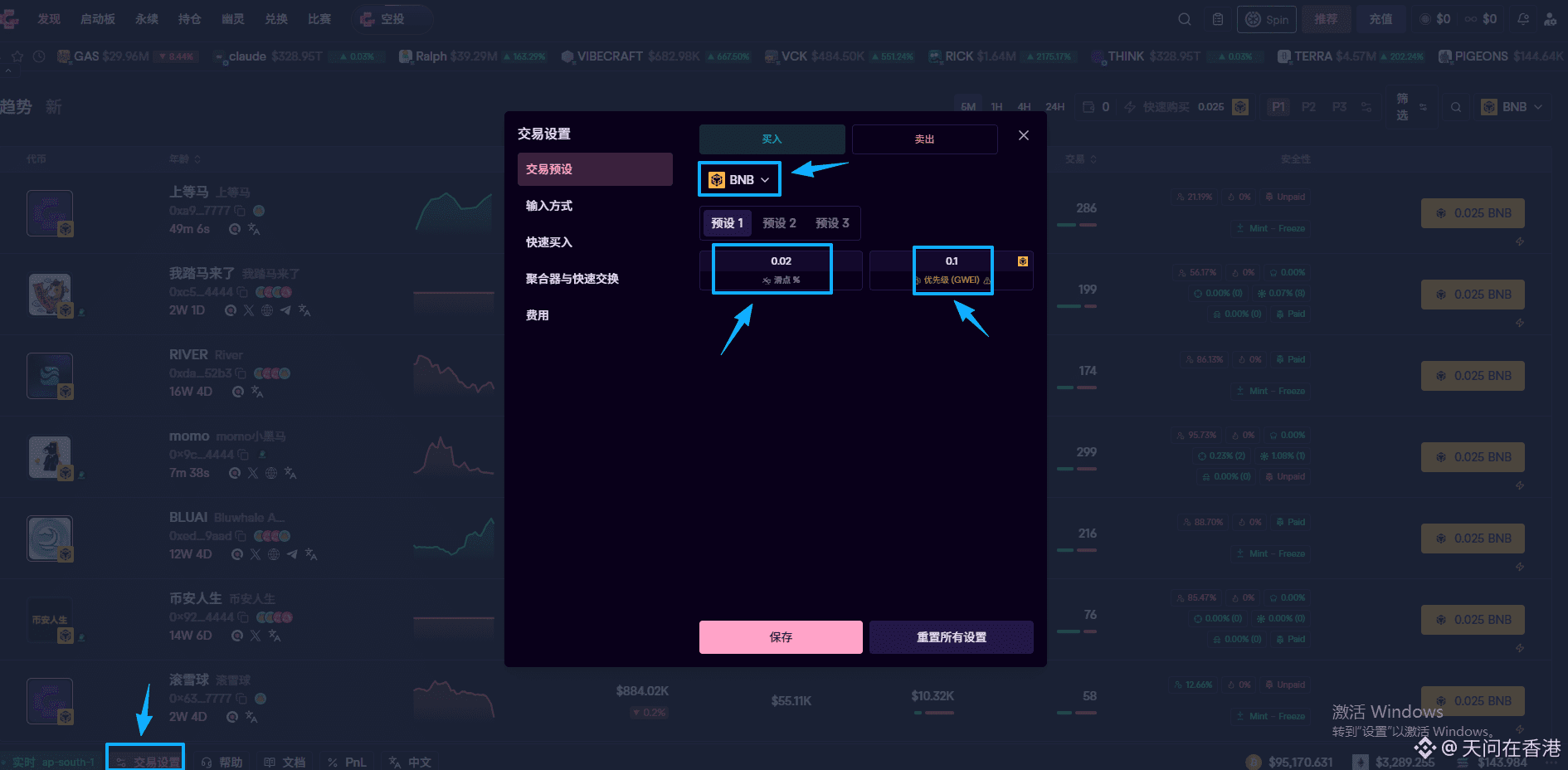 左下角交易设置 → 交易预设 → 买入 → BNB 链 → 滑点 0.01 → 优先级 0.1→保存