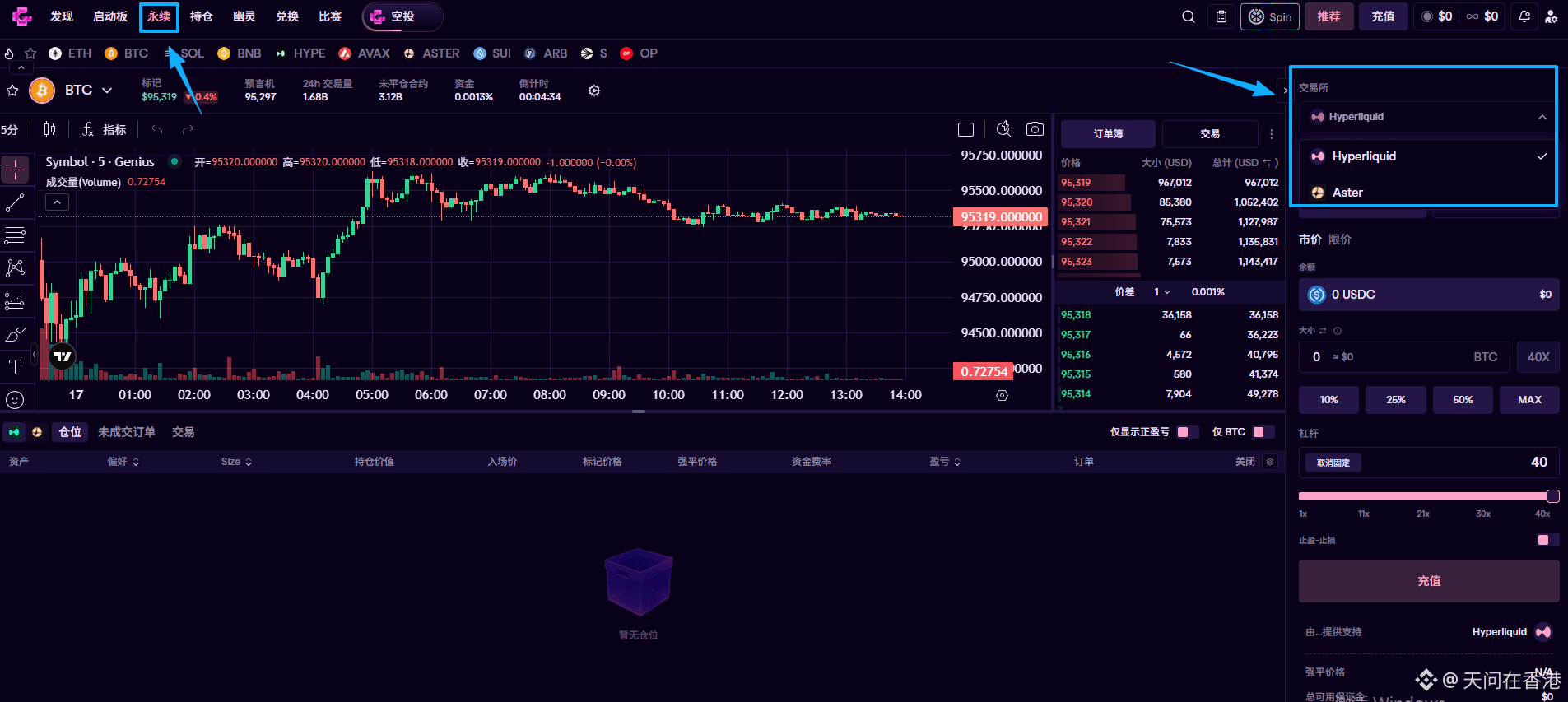 左上角永续→Hyperliquid或者Aster两个交易所都可以,可以用两个号对冲,同样价格和同样杠杆倍数同时开单,一个开多,一个开空,持有10分钟再同时平仓即可,每$1000交易量 = 1 GP。