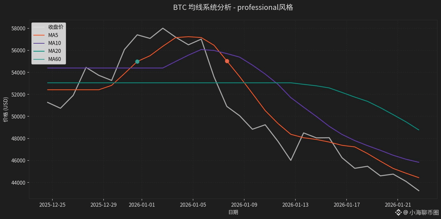 图3:BTC均线系统分析,显示MA5、MA10、MA20、MA60空头排列及压制