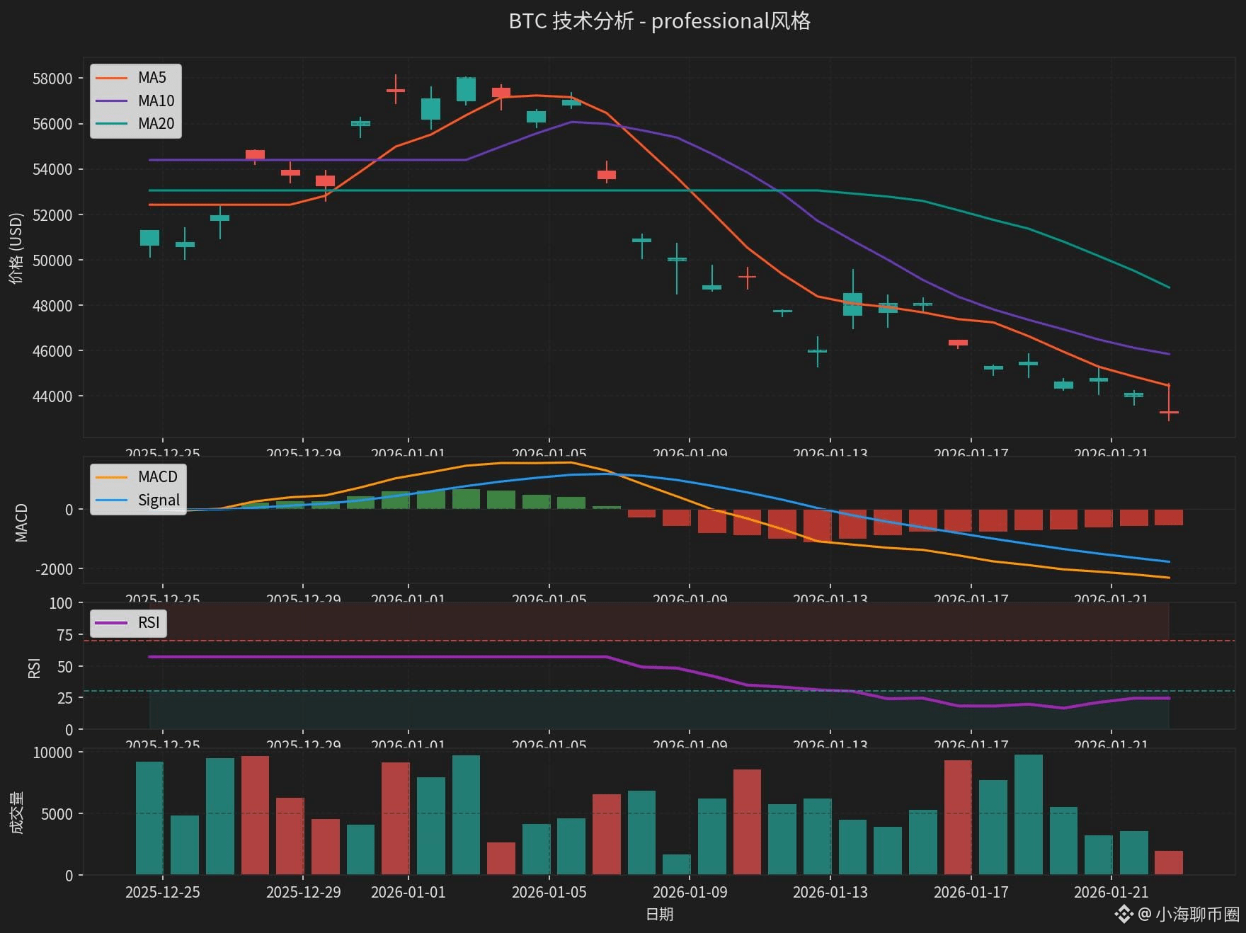 图1:BTC日线K线图,叠加MACD、RSI、均线系统及成交量,显示空头排列格局