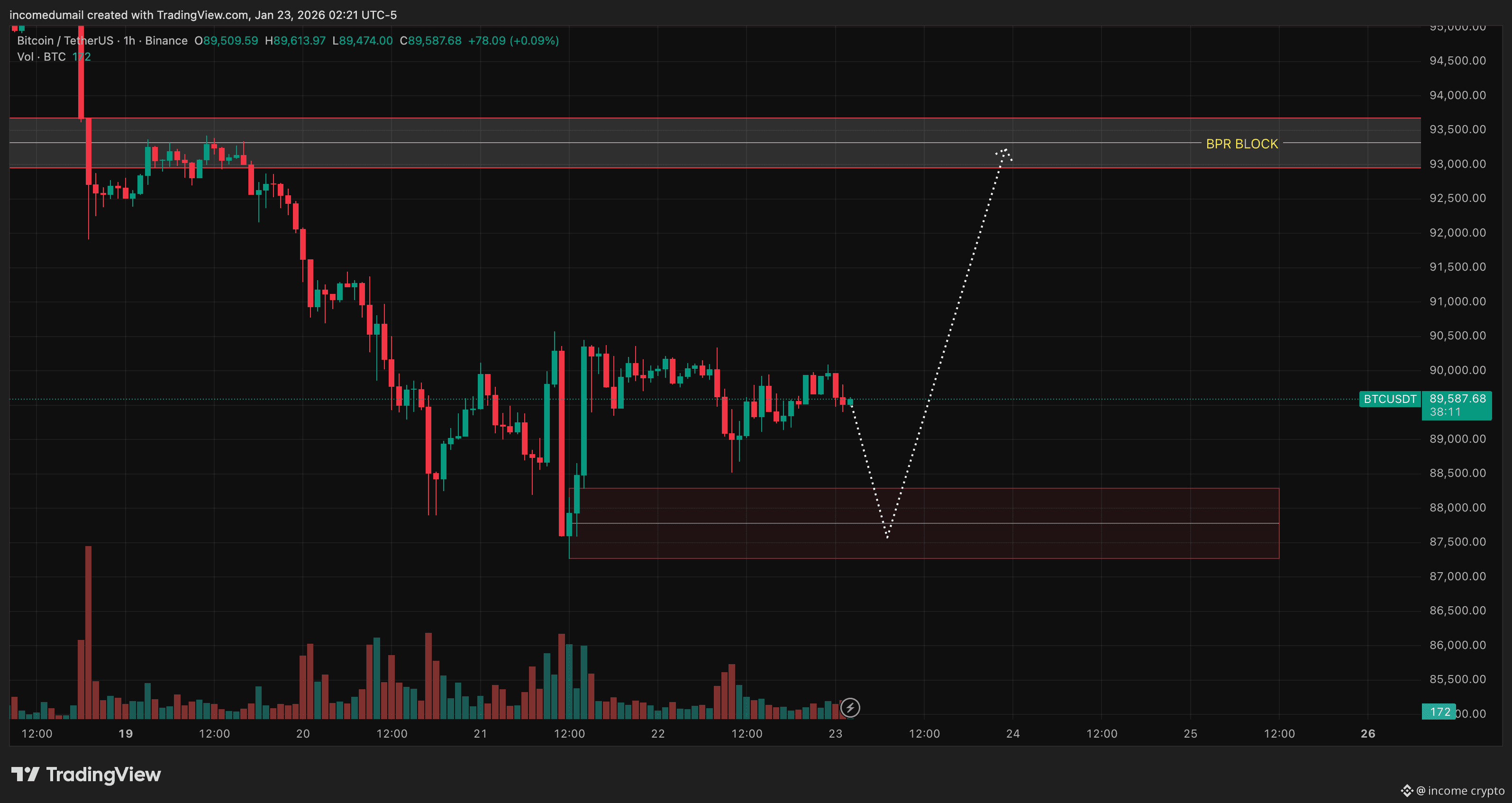 Below price is a well-defined demand zone around 87.5k–88.5k, where buyers previously stepped in with force.
