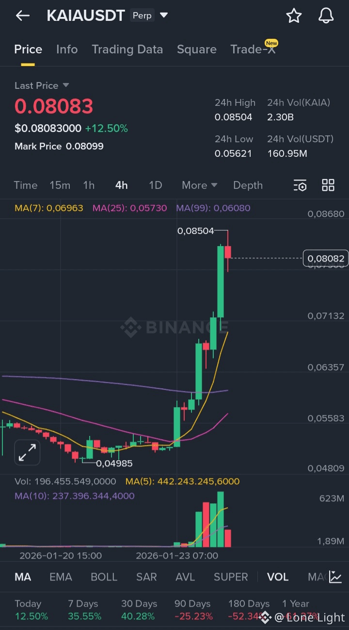 Đến hôm nay trên CoinMarketCap, KAIA đang quanh 0,08 USD, tăng hơn 60% từ đáy chỉ trong 3 ngày; riêng 24h gần nhất tăng ~40%, khối lượng giao dịch tăng hơn 4 lần (483%) so với ngày trước đó.