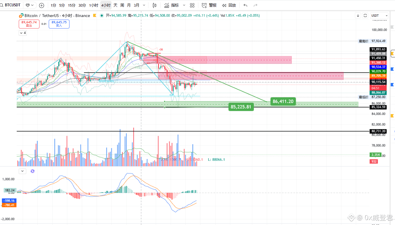 BTC:价格进入前期支撑区间,但未突破下降趋势线,暂不看多;当前测试下跌 FVG 缺口,下一目标 85000-86000 美元