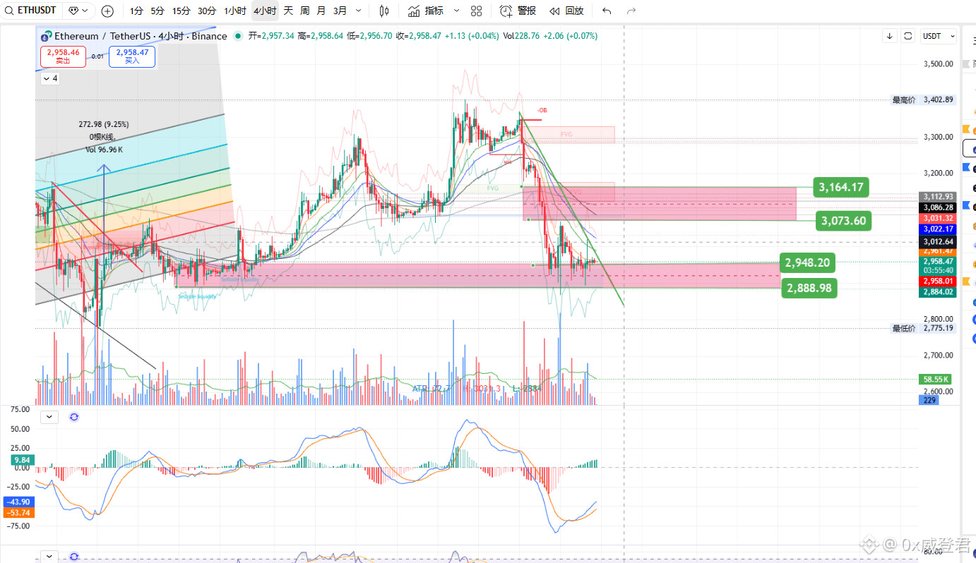 ETH:快速急跌测试 12 月支撑位,价格低于下降趋势线;短期先测试 FVG 缺口,随后需观察 2888-2948 美元区间能否形成有效支撑