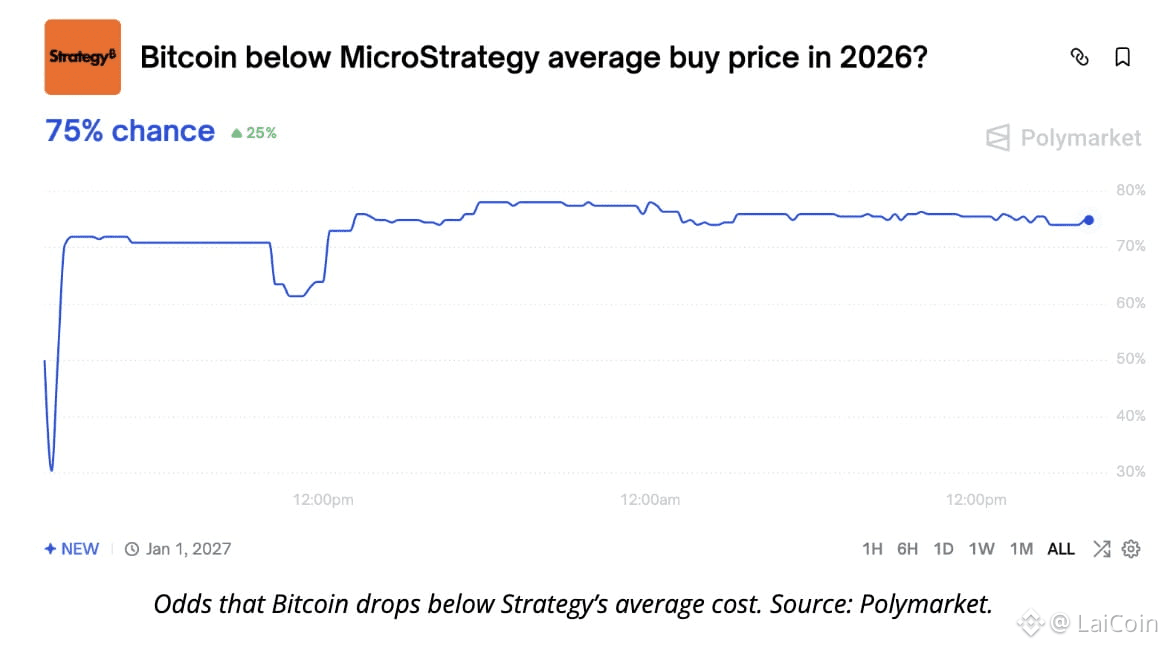 Prediction markets assign a 75% probability that BTC trades below Strategy’s average cost basis (~$75,979) this year.