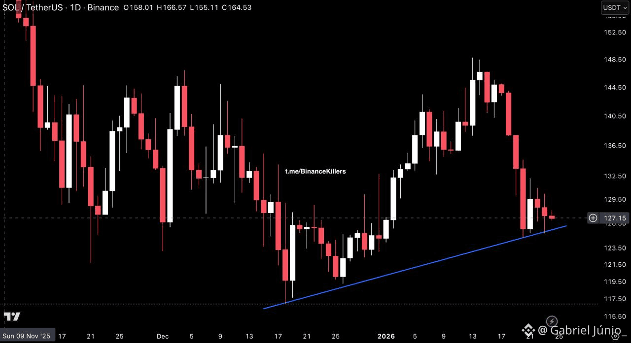 $SOL está recuando para a linha de tendência de alta diária, atualmente se mantendo na faixa de 125–127. Essa zona está atuando como um suporte estrutural após a recente rejeição da região de 145–148.