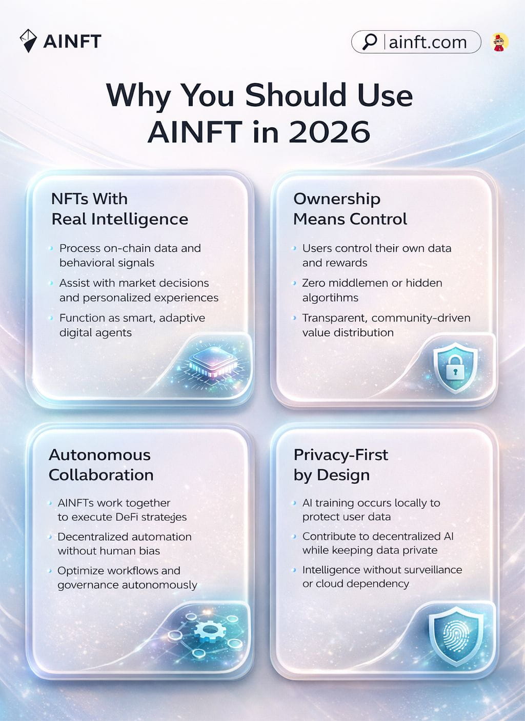 AINFTs process on-chain activity, behavioral signals, and market trends to assist with decision-making, automation, and personalization.
