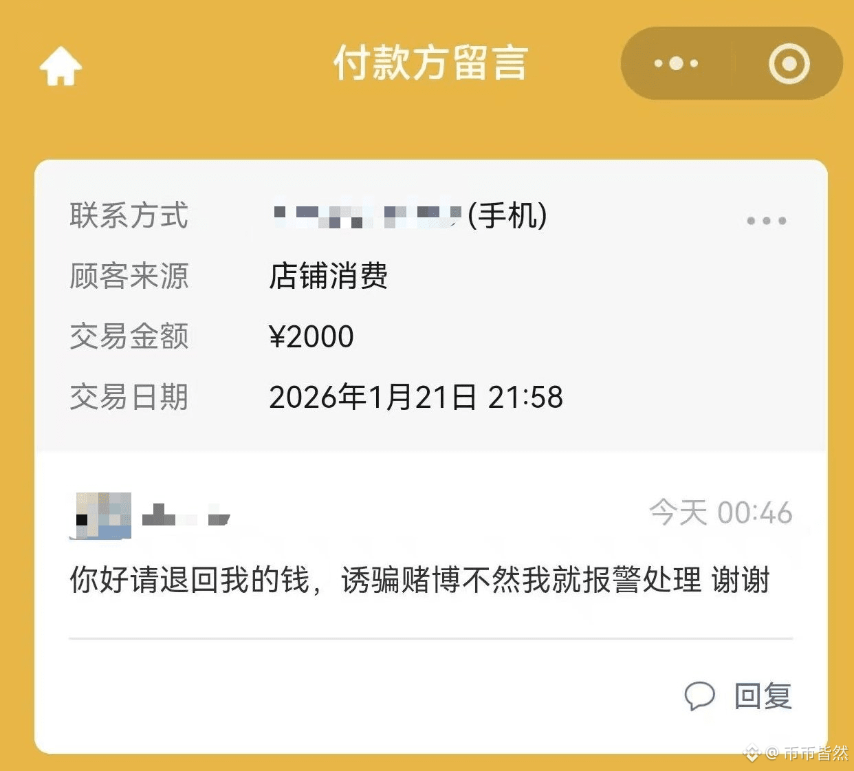 群友A收款用的是微信,交易完成后不到半小时,收到了来自付款方C的留言,要求群友A给他退钱,否则就报警说诱骗赌博。