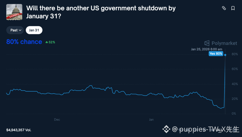 剛消停不到三個月,華盛頓又要鬧「斷糧」了!目前距離 1/30 資金到期剩不到一週,Polymarket 上的玩家已經押注 80% 的機率政府會再次關門。這次兩黨互不相讓,火藥味比上次還濃!🔥$BTC $ETH $BNB