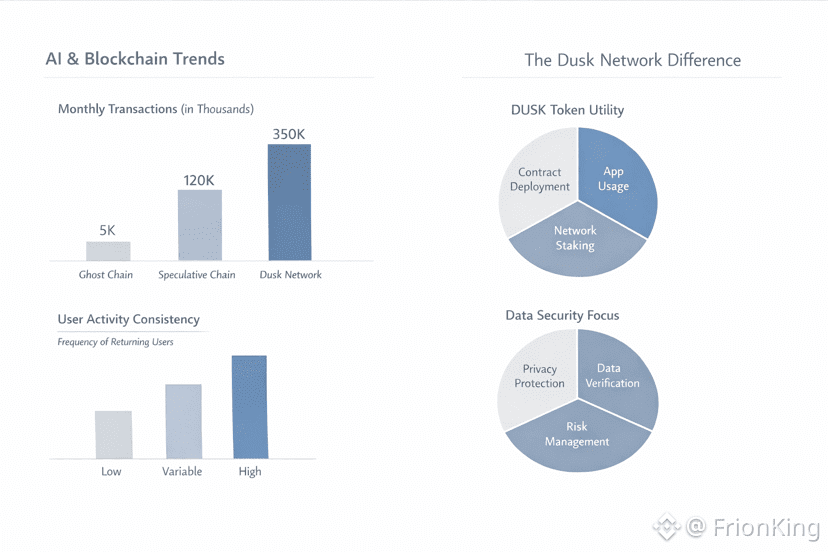 • When I look at Dusk on-chain data, I am not searching for sudden spikes. It is the rhythm of consistent usage that matters to me. Every transaction burns a little gas, every contract deployed leaves a footprint, every user who returns demonstrates habit, not speculation. On infrastructure-let alone potentially AI-driven finance-the real value is created in repeated behavior. I've seen too many blockchains showcasing volume with ghost towns for ecosystems and no follow-through in demand.