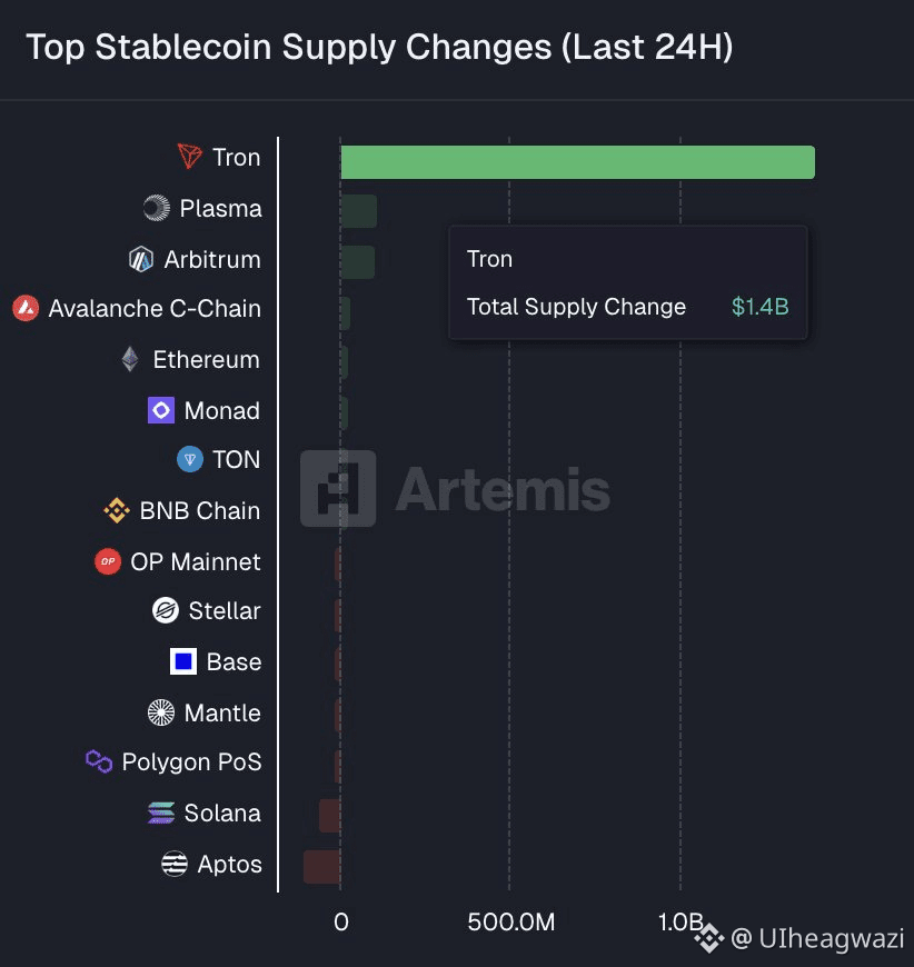 In the last 24 hours, TRON recorded the largest stablecoin supply inflow of any blockchain, adding $1.4 billion in new stablecoin supply, according to Artemis data.