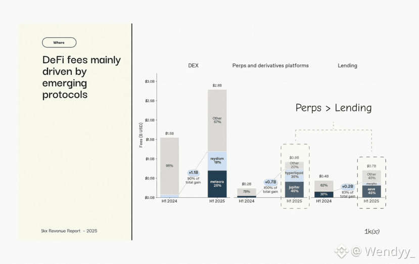 The revenue data reflects this shift clearly. In 2024, on-chain derivatives generated far less in fees than lending. By 2025, Perp DEX fees have surged dramatically, outpacing lending not because more capital is locked, but because capital is moving faster. Volatility, once a risk factor, becomes a direct input to revenue.