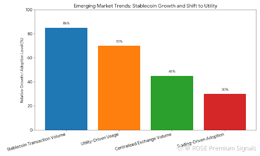Where Plasma becomes particularly dangerous to incumbents is in emerging markets. Retail users in high-adoption regions do not care about decentralization philosophy. They care about inflation resistance, transfer speed, reliability, and accessibility. Stablecoins already serve as de facto savings accounts and payment rails across Latin America, Africa, Southeast Asia, and parts of the Middle East. Plasma’s architecture compresses the full banking stack — settlement, custody, compliance, and payments — into a permissionless protocol layer. On-chain data already shows stablecoin transaction volume in emerging markets growing faster than centralized exchange volume, signaling a structural shift from trading-driven adoption to utility-driven usage.