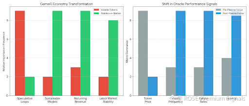 Oracle design becomes more straightforward yet more critical. When transactions settle in stable value, oracle manipulation risk shifts from price volatility to settlement reliability. Plasma incentivizes oracle networks to prioritize uptime, latency, and redundancy over price discovery. This reorients the oracle market toward infrastructure-grade reliability rather than speculative feed accuracy. On-chain metrics tracking oracle update frequency, failure rates, and latency will become leading indicators of network health, replacing token price metrics as the dominant performance signals.