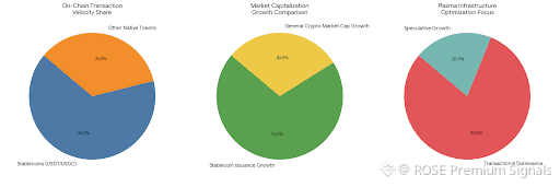 Capital flows are already hinting at where this design trajectory leads. Stablecoin issuance is accelerating faster than crypto market capitalization. On-chain data shows USDT and USDC velocity surpassing that of most native tokens combined. Payment processors, fintech platforms, and neobanks are increasingly integrating blockchain rails directly, bypassing traditional correspondent banking systems. Plasma is positioned precisely at this convergence point, offering infrastructure optimized not for speculative growth, but for transactional dominance.
