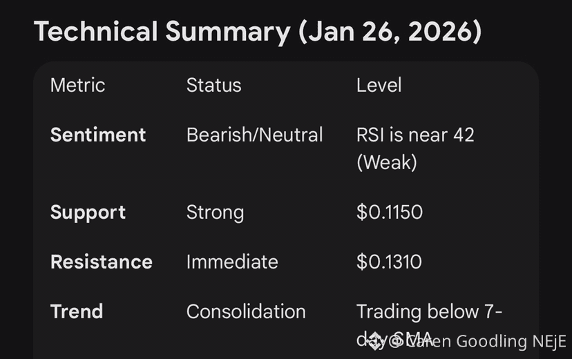 • The "Downs": The price hit a 24-hour low of $0.1173. This dip is largely attributed to a broader market "fear" phase and the anticipation of a significant token unlock event scheduled for March 2026. Sellers are currently defending the $0.13 resistance level aggressively.