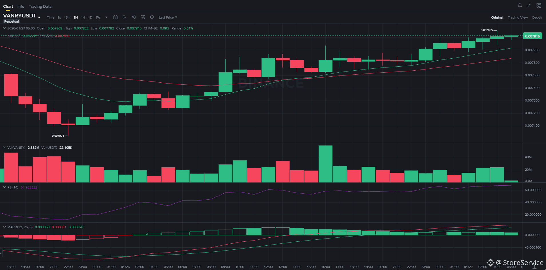 Current Status: The 4-hour chart displays a steady recovery from the local bottom of $0.0070. An RSI of 64 indicates buyer strength, though it is approaching overbought territory.