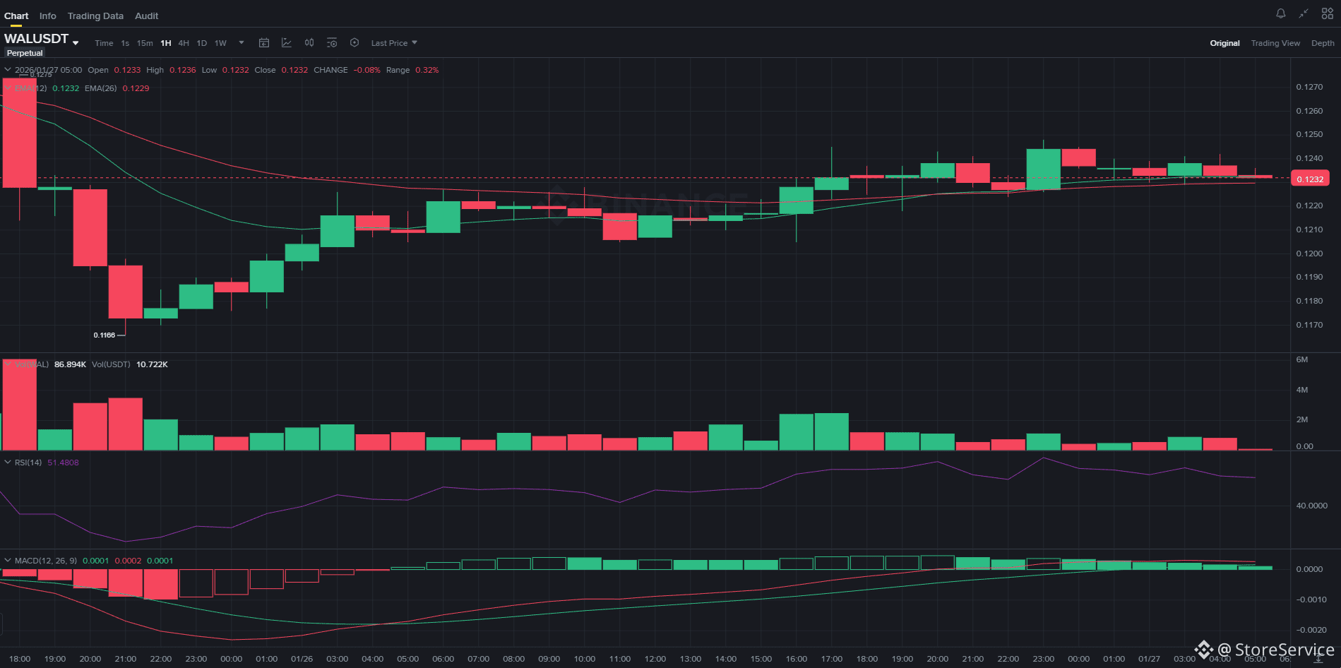 Current Status: The chart shows consolidation following a significant drop (from $0.17 to $0.124). The price is attempting to stabilize above the EMA(12) on the 1-hour timeframe.