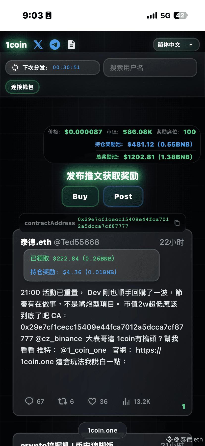 綁定帳號 → 發帶 CA 推文 → 拿互動 → 等倒計時 → 自動領 BNB